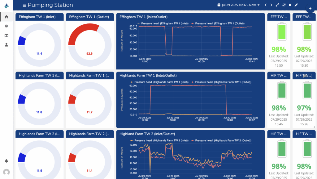 Hubit delivered a full SmartFlow solution for SES Water, integrating pressure and pump monitoring across their network. Using custom sensors and LoRaWAN connectivity, the system provides real-time alerts, operational insights, and leak detection analytics.